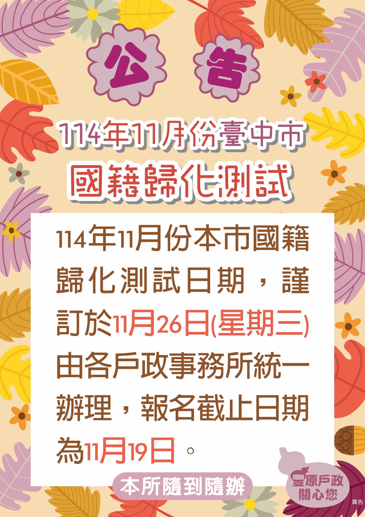 114年11月份本市國籍歸化測試,謹訂於11月26日(星期三)由各戶政事務所統一辦理,報名截止日期為11月19日。