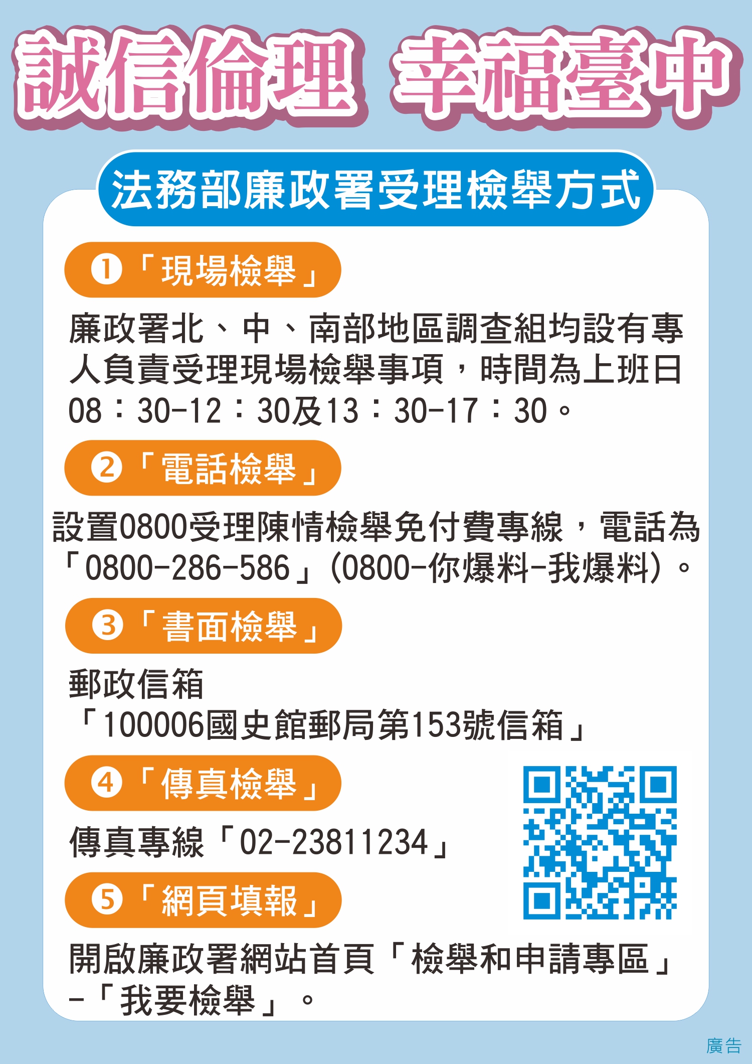 - 「傳真檢舉」:傳真專線「02-23811234」。
