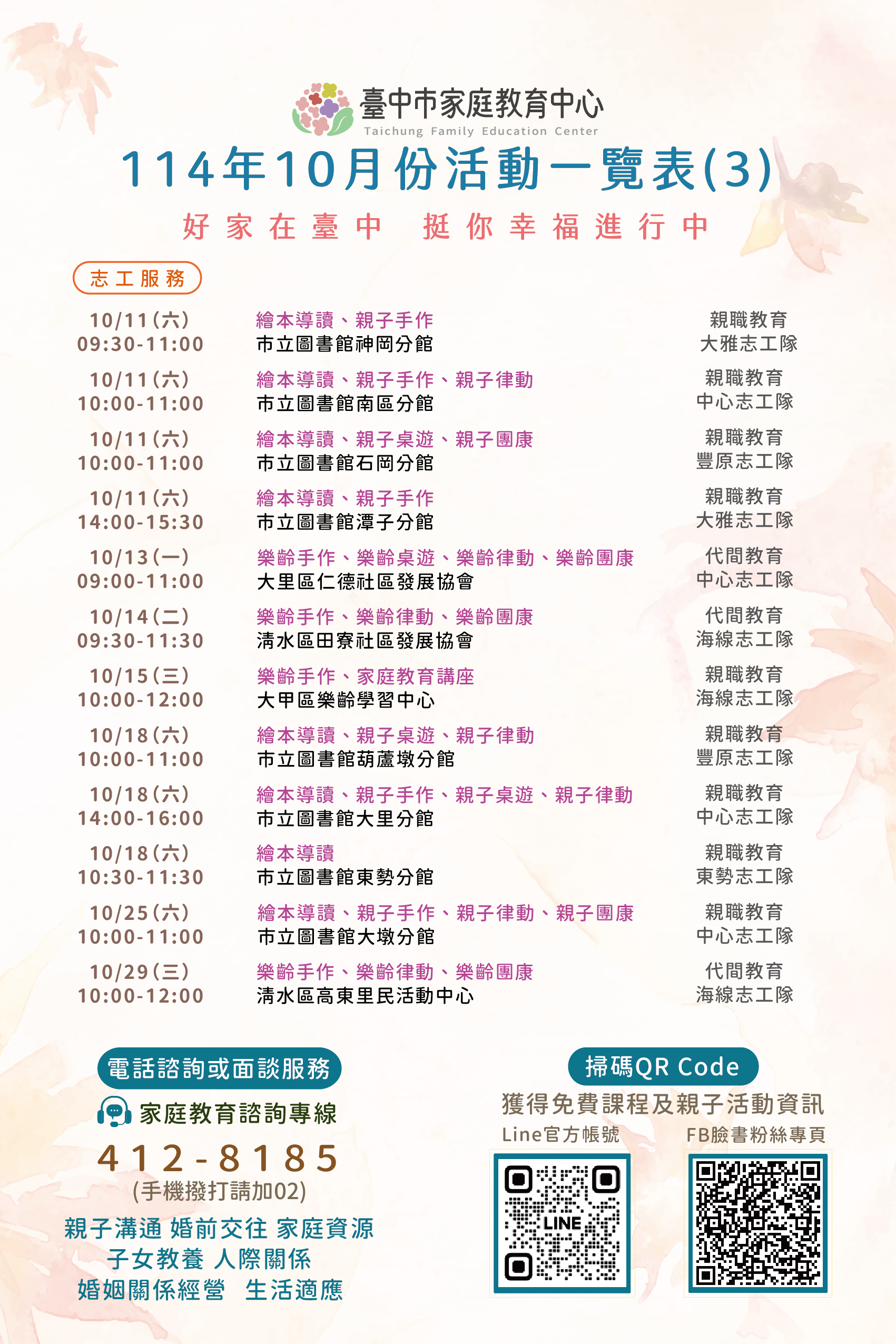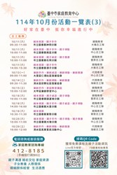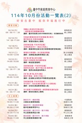 114年10月份活動一覽表 中秋上架! 臺中市家庭教育中心邀您一起參與本月精彩多元的課程活動~從親職教育、數位教養、婚姻經營、青少年溝通、情緒管理、幼兒教養到原住民族家庭教育、子職關係探索、婚前交往準備等主題應有盡有,讓我們在溫馨互動的氛圍中學習,累積創造幸福、和諧家庭的力量! 更多詳細內容洽該中心活動海報、FB及LINE公告資訊