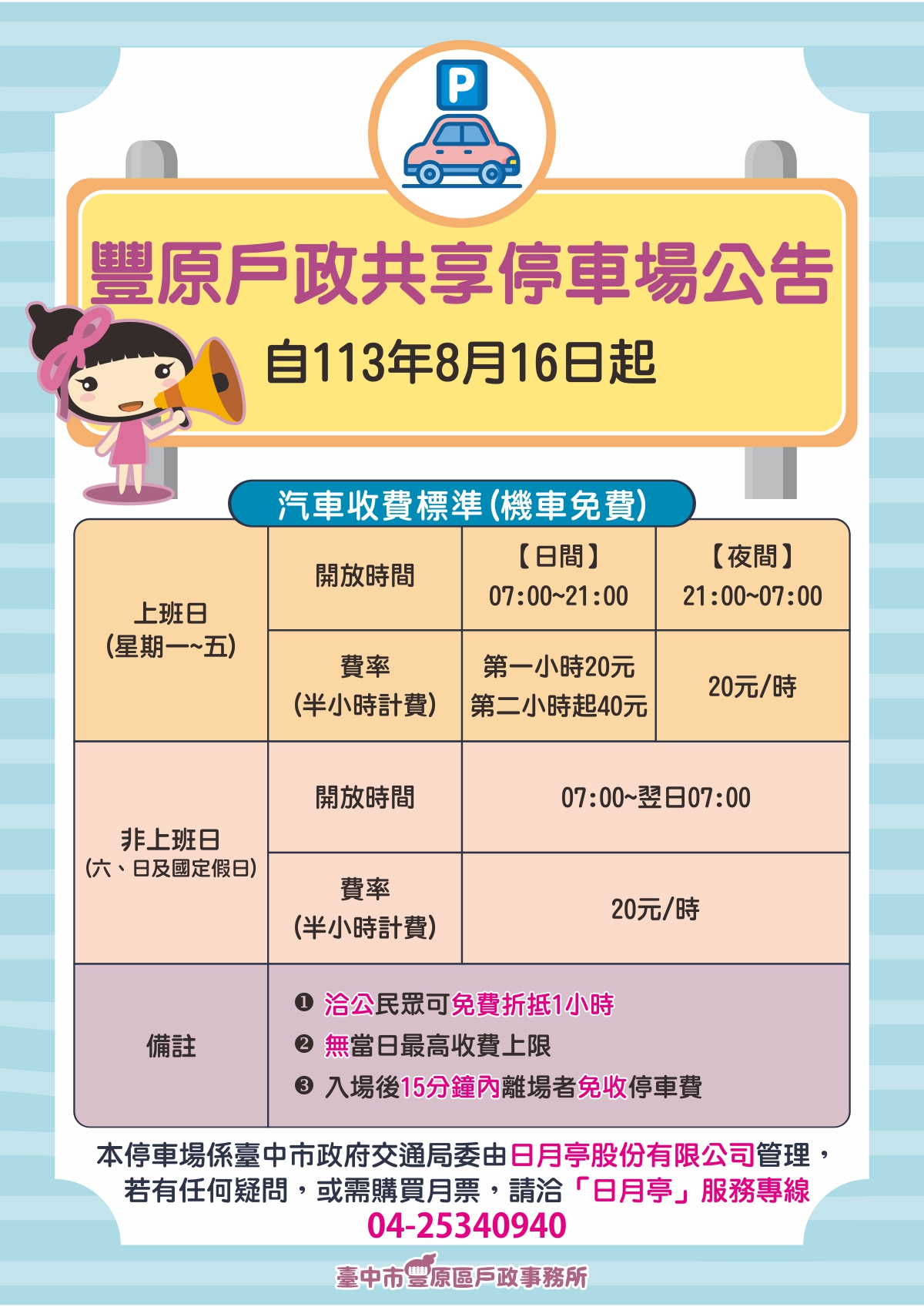 本停車場係臺中市政府交通局委由日月亭股份有限公司管理,若有任何疑問,或需購買月票,請洽「日月亭」服務專線04-25340940
