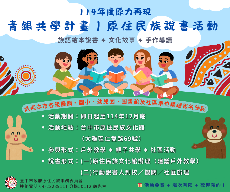 計畫自即日起實施至114年12月底,除結合族語繪本、文化故事與手作導讀,並於本市原住民文化館辦理外,亦可由說書人至各校園、機關或場館辦理行動說書活動,歡迎踴躍報名參與。