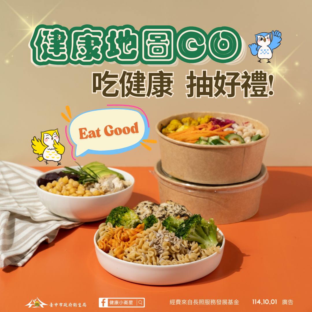 「114年跟著健康地圖 帶您吃出健康力」活動 活動期間:114年10月1日至10月31日。 參加方式:民眾於活動期間至本市「運動及健康餐飲地圖 」上店家消費,並上傳消費證明(餐點照片及店家招牌)至市府衛生局健康小衛星臉書粉絲專頁,填寫抽獎資訊即可參加抽獎。 獎勵內容:抽出100位符合資格民眾,每位提供價值新臺 幣200元商品卡。 活動詳情請至「臺中市衛生局-健康小衛星」粉絲專頁查看活動訊息。