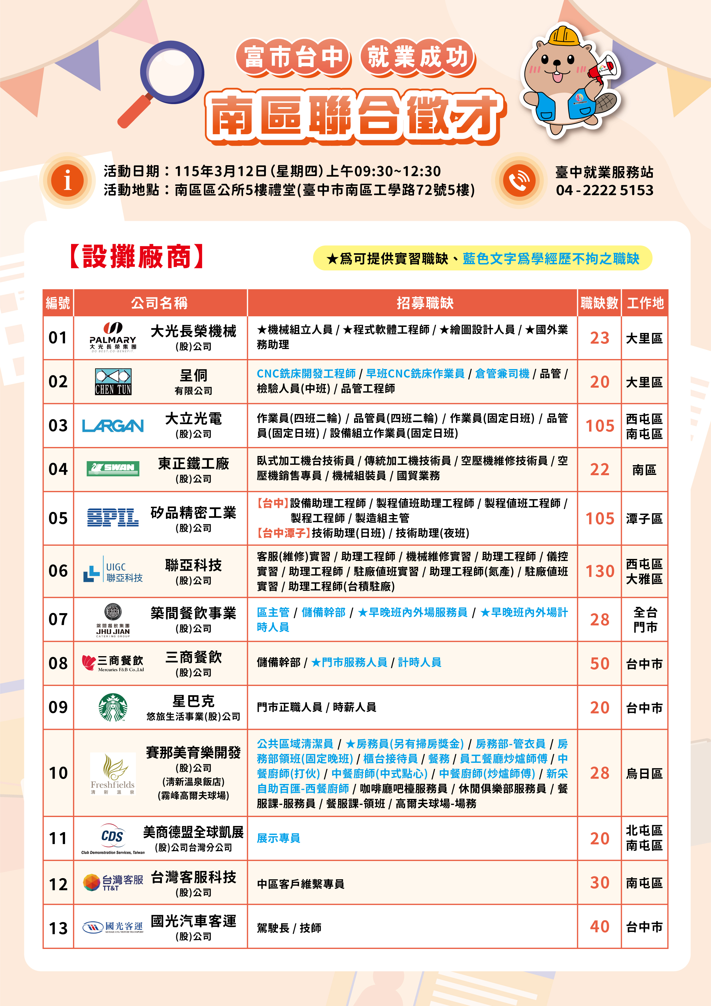 臺中市政府3月12日上午9:30至12:30,在臺中市南區區公所5樓禮堂舉辦2026「富市台中 就業成功」南區聯合徵才,邀請大光長榮、矽品、三商餐飲、築間餐飲等13家廠商徵才,提供600個以上工作機會,查詢相關資訊,洽詢電話04-22225153。